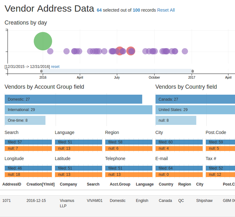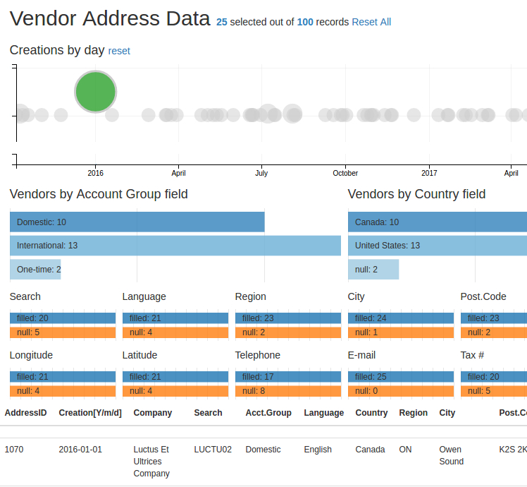 Putting the mouse pointer over the green circle will reveal a tooltip with the text for the number of vendors created (25) and the date of creation (Jan 01 2016). Clicking it will automatically change all other data in the web page. The topmost line now reads “Vendor Address Data 25 selected out of 100 records Reset All.” The table at the bottom show only the 25 records that were created on 2016-01-01.