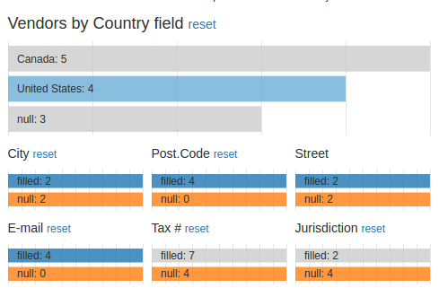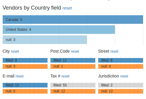 A subsequent selection of the box now labelled "null: 12" of the 'Tax' row chart changes the breakdown of the 'Vendors by Country field' chart. It now shows that, out of the 12 records not having tax numbers and tax jurisdictions, 5 are vendors from Canada and 4 are vendors from the United States.
