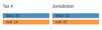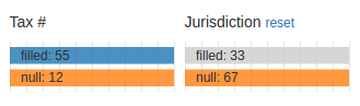 Clicking on the box labelled "null: 67" of the 'Jurisdiction' row chart reveals that 12 of the 67 do not have tax numbers as well. The converse of the revelation is that 2 of the 14 records that do not have tax numbers are filled with tax jurisdictions.